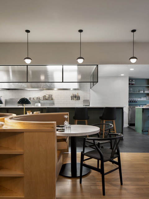 L’un des éléments les plus marquants de l’aménagement proposé par Microclimat - qui permet justement la réduction des places - est sans aucun doute l’utilisation du mobilier intégré. Celui-ci organise l’espace. Qu’il s’agisse des banquettes semi-circulaires au centre de la salle à manger, de la banquette longeant le restaurant surmontée d’étagères murales ou des deux comptoirs en enfilade, le mobilier permet de créer des ambiances distinctes tout en préservant l’esprit d’une grande aire ouverte.