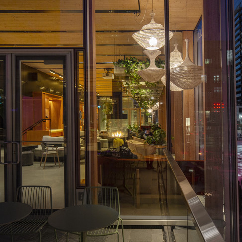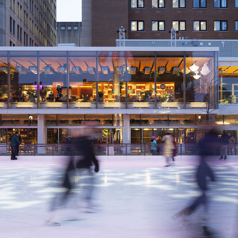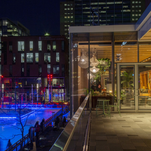 Le rez-de-chaussée est doté de murs vitrés complètement rétractables pour s’ouvrir sur l’esplanade en été. Ainsi le restaurant peut se prolonger en terrasse sur l’espace public et le local de location de patin se transforme en commerce de type pop-up pour contribuer à la vitalité des lieux pendant toute l’année.
