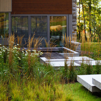 + Terrasse en ipée + Piscine en fibre de verre + Végétaux [Arenaria verna + Amelanchier canadensis + Chrysanthemum superbum ’Becky’ + Calamagrostis acutiflora ’Karl Foerster’ + Iris sibirica ’Rimouski’ + Adiantum pedatum + Microbiata decussata]