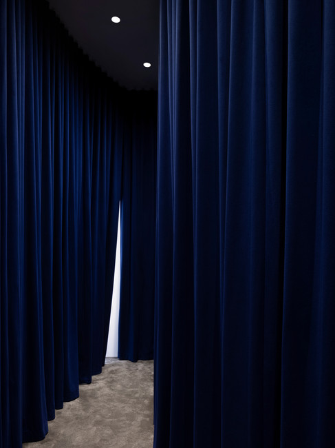 Un rideau monochrome de velours bleu pleine hauteur sépare la vaste salle d’exposition du corridor incurvé qui se dissimule derrière, espace d'attente à l'aspect théâtral et à l'ambiance ambiguë dont l'éclairage ciblé ajoute de la profondeur. Dissimulées par les rideaux, on retrouve les cabines d'essayage surmontées d'une verrière préexistante fournissant un éclairage naturel zénithal qui contraste avec celui des pièces précédentes.