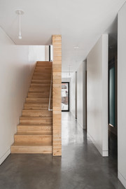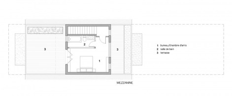 Sur cette parcelle étroite de pieds de largeur, les pièces de vie, constituant un grand volume ouvert, sont situées au deuxième niveau de la maison. Le rez-de-chaussée accueille les vestibules donnant sur la rue et la ruelle, l’escalier reliant les étages, ainsi que deux chambres et deux salles de bain.